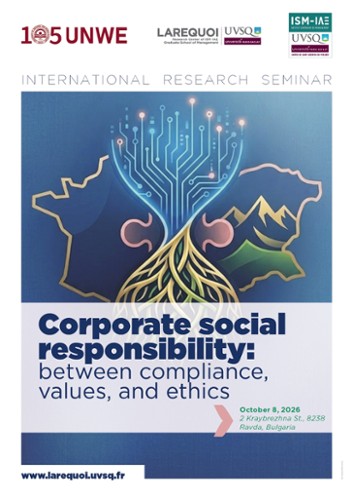 - Corporate social responsibility: between compliance, values, and ethics8 octobre 2026Cette journée d’études invite les chercheurs, en particulier français et bulgares, à explorer et analyser la RSE, dans ses pratiques, entre les obligations de conformité, les valeurs et l’éthique, en explorant la manière dont les organisations évoluent et agissent par rapport aux obligations légales, à leurs engagements normatifs et au besoin de légitimité sociale et politique.