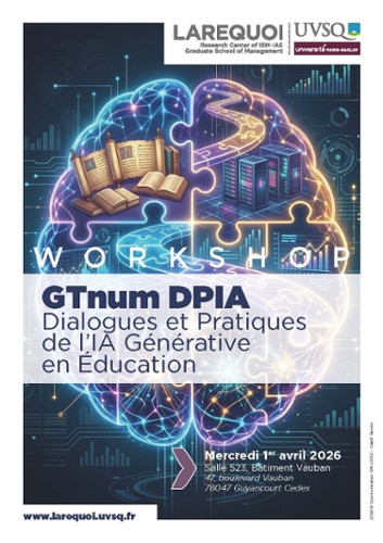 - Workshop GTnum DPIA1 avril 2026Workshop du GTnum DPIA (Dialogues et Pratiques de l'IA Générative en Éducation), le mercredi 1er avril en salle 523 (47, boulevard Vauban 78047 Guyancourt Cedex) ;