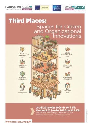 - Colloque international – Les tiers-lieux, espaces d’innovations citoyennes et organisationnelles22 janvier 2026Les 22 et 23 janvier 2026, le Larequoi et l’ISM-IAE de Versailles Saint-Quentin-en-Yvelines accueilleront un colloque scientifique international consacré aux tiers-lieux, entendus comme des espaces clés de renouvellement des pratiques citoyennes, organisationnelles et démocratiques.